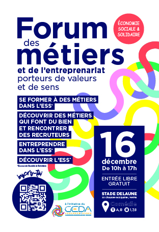 Préinscription via qr code ou sur place : obligatoireDécouvrez le programme en détail ici : geda-am.org/le-forum-de-lemploi-et-de-la-creation-dans-leconomie-sociale-et-solidaire/